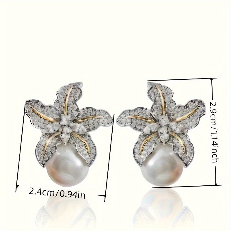 Elegante, mit Zirkonia besetzte zweifarbige Blumen-Perlen-Ohrringe