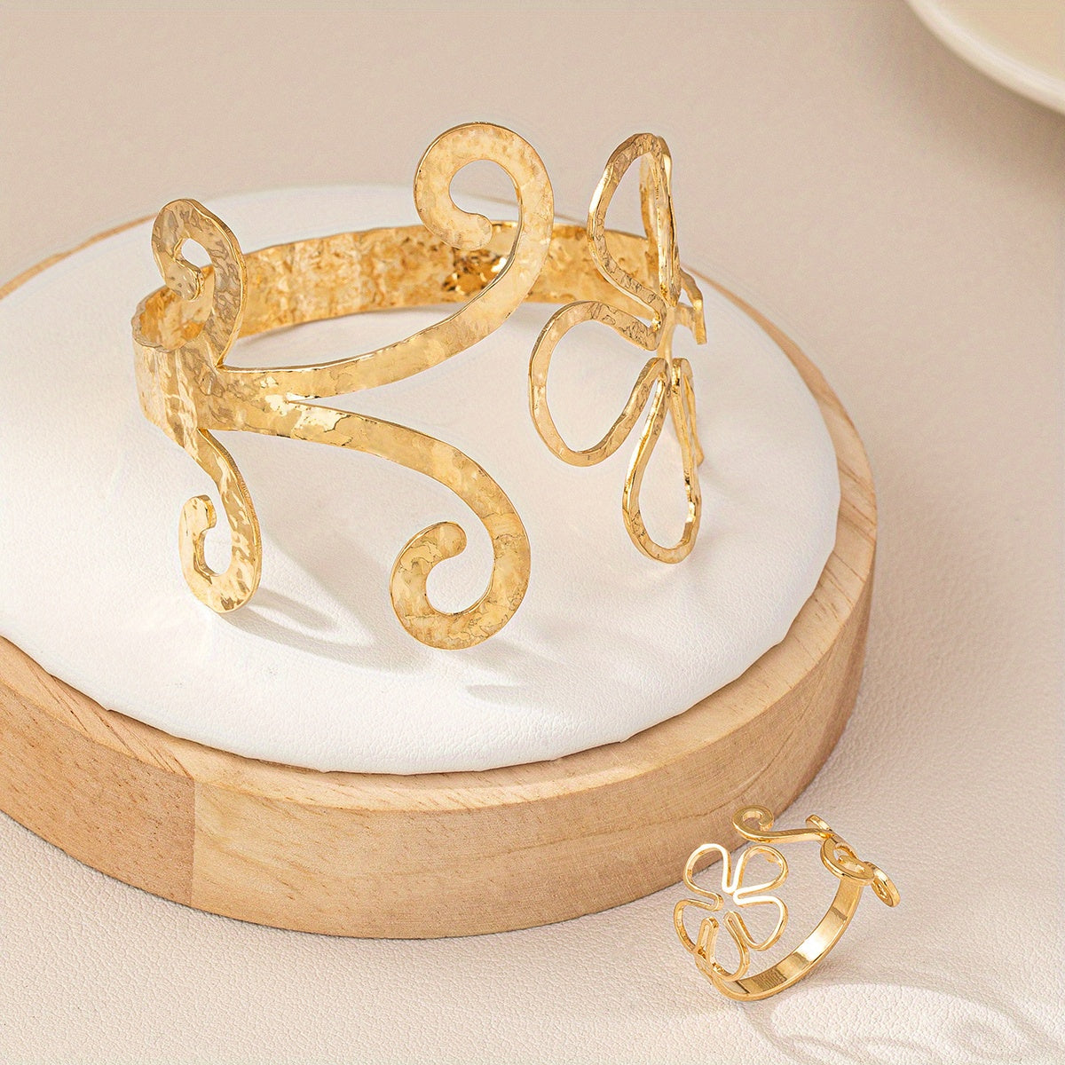 Elegantes Geometrisches Blumenmuster Verstellbares Armreif- und Ring-Set