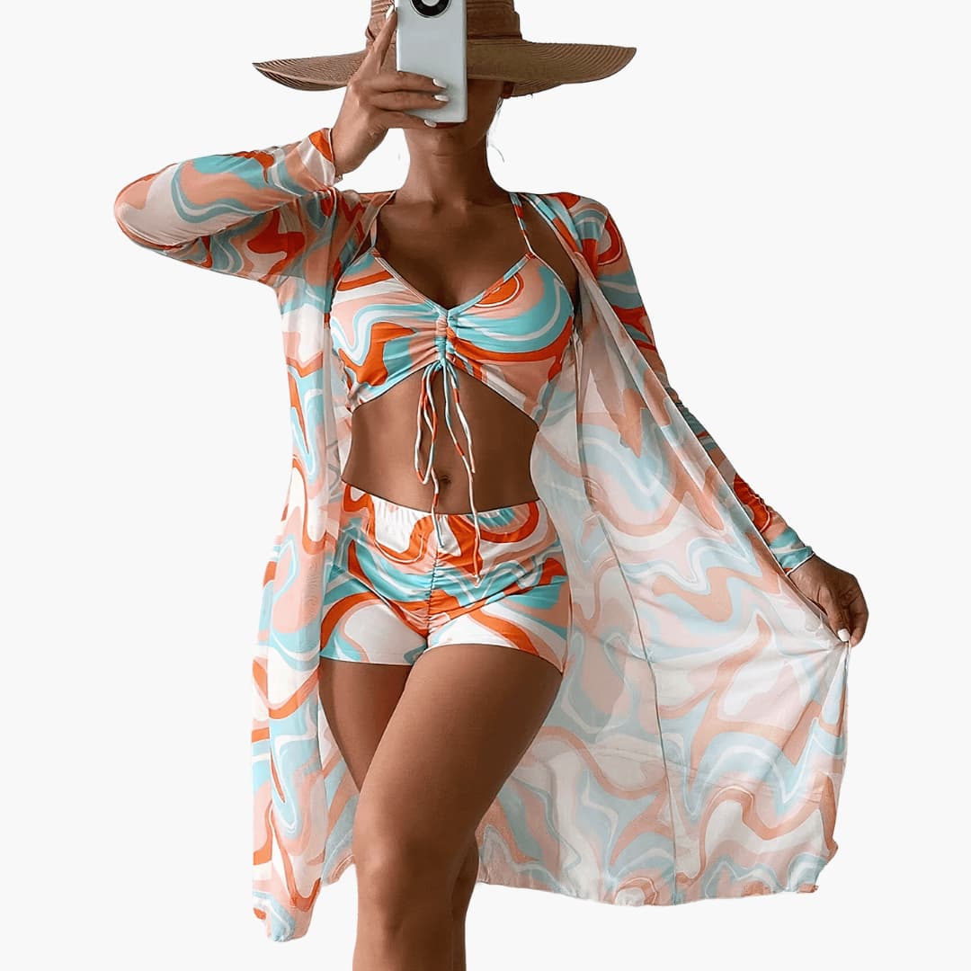 Dreiteiliges Strandbekleidungsset für Damen mit einem leichten Stoff, ideal für den Sommer. Enthält ein langärmeliges Kimono, ein ärmelloses Crop-Top mit Kordelzug und eine hochtaillierte Shorts. Perfekt zum Kombinieren und für lässige Outfits bei warmem Wetter. Ideal für den Strand, zum Entspannen oder für lockere Tagesaktivitäten.