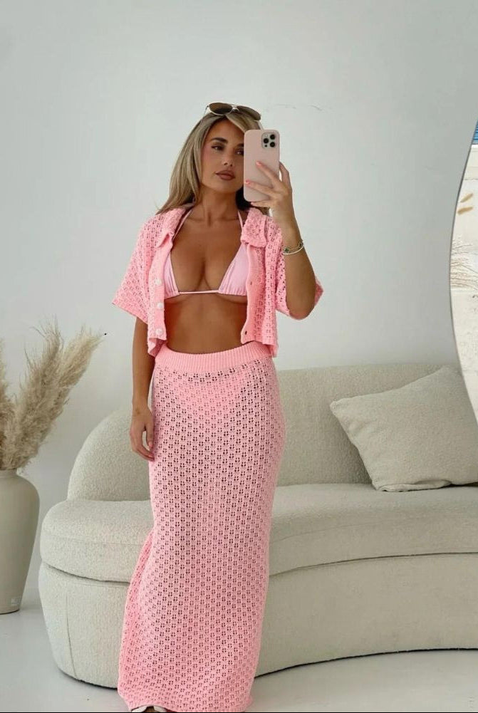Übernehmen Sie mühelos die sommerliche Eleganz mit dem stilvollen Adele Set mit Häkelmuster, einem wunderschön gestalteten Zweiteiler für den Chic an heißen Tagen. Mit einem zarten Häkelmuster versehen, besteht dieses Set aus einem eleganten Rock und einem schmeichelhaften Triangel-BH und bietet eine perfekte Mischung aus Raffinesse und Komfort. Ob Sie sich am Strand sonnen oder es für einen entspannten Tag tragen, dieses Set sorgt für einen entspannten und topmodischen Look.