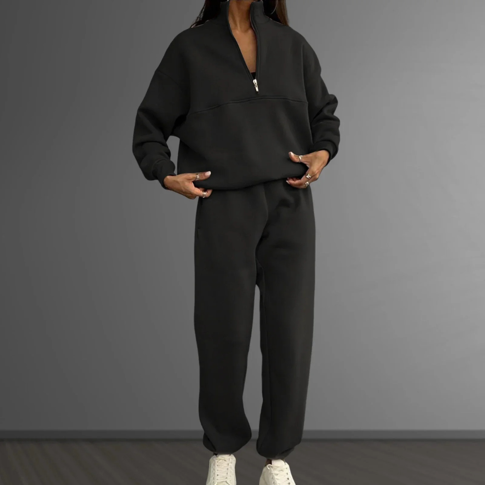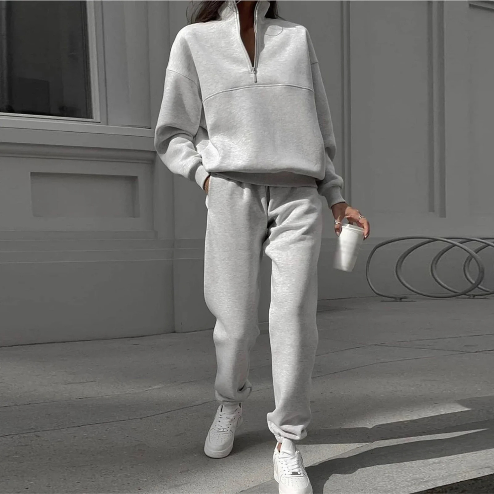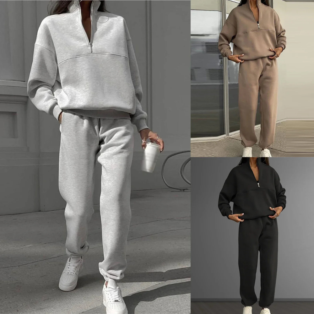 Tauchen Sie ein in die Welt des Komforts mit dem lässigen Adeline-Ensemble, das entworfen wurde, um Ihnen einen Hauch von Stil zu verleihen und Sie gleichzeitig warm zu halten. Hergestellt aus hochwertigem Baumwoll-Fleece, ist dieses Ensemble perfekt für entspannte Tage zu Hause oder legere Ausflüge.