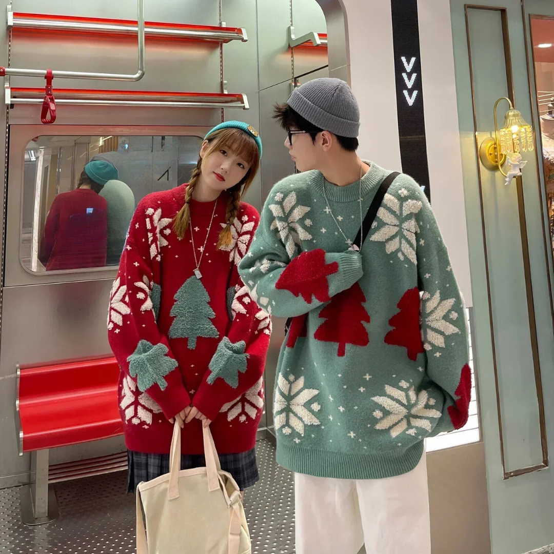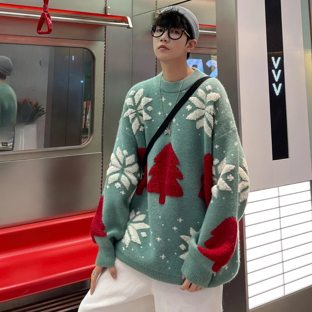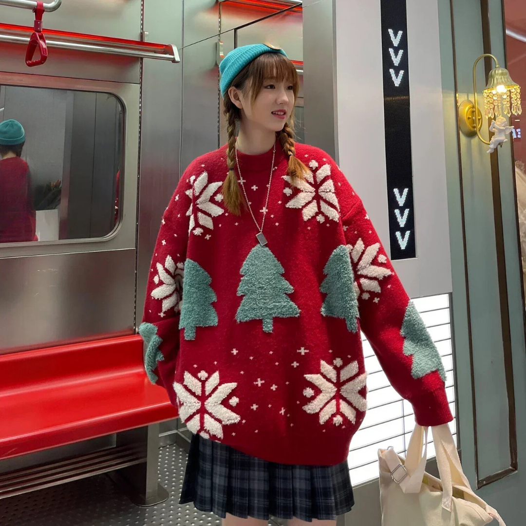 Dieser Pullover zeigt ein auffälliges Design mit festlichen Baum- und Schneeflockenmuster. Der lockere Schnitt und die langen Ärmel bieten vollständige Abdeckung und sind ideal für kühleres Wetter. Eine perfekte Wahl für alle, die die Saison mit lebendigen, verspielten Designs feiern möchten.