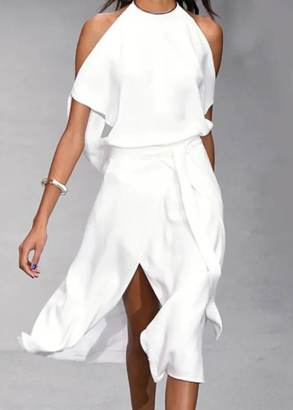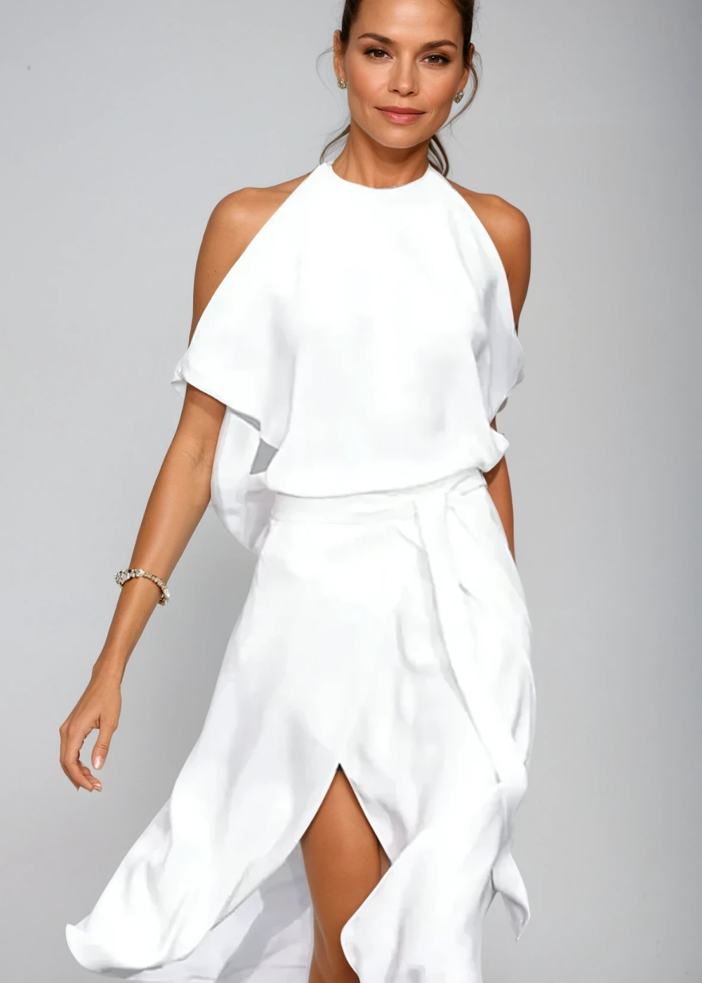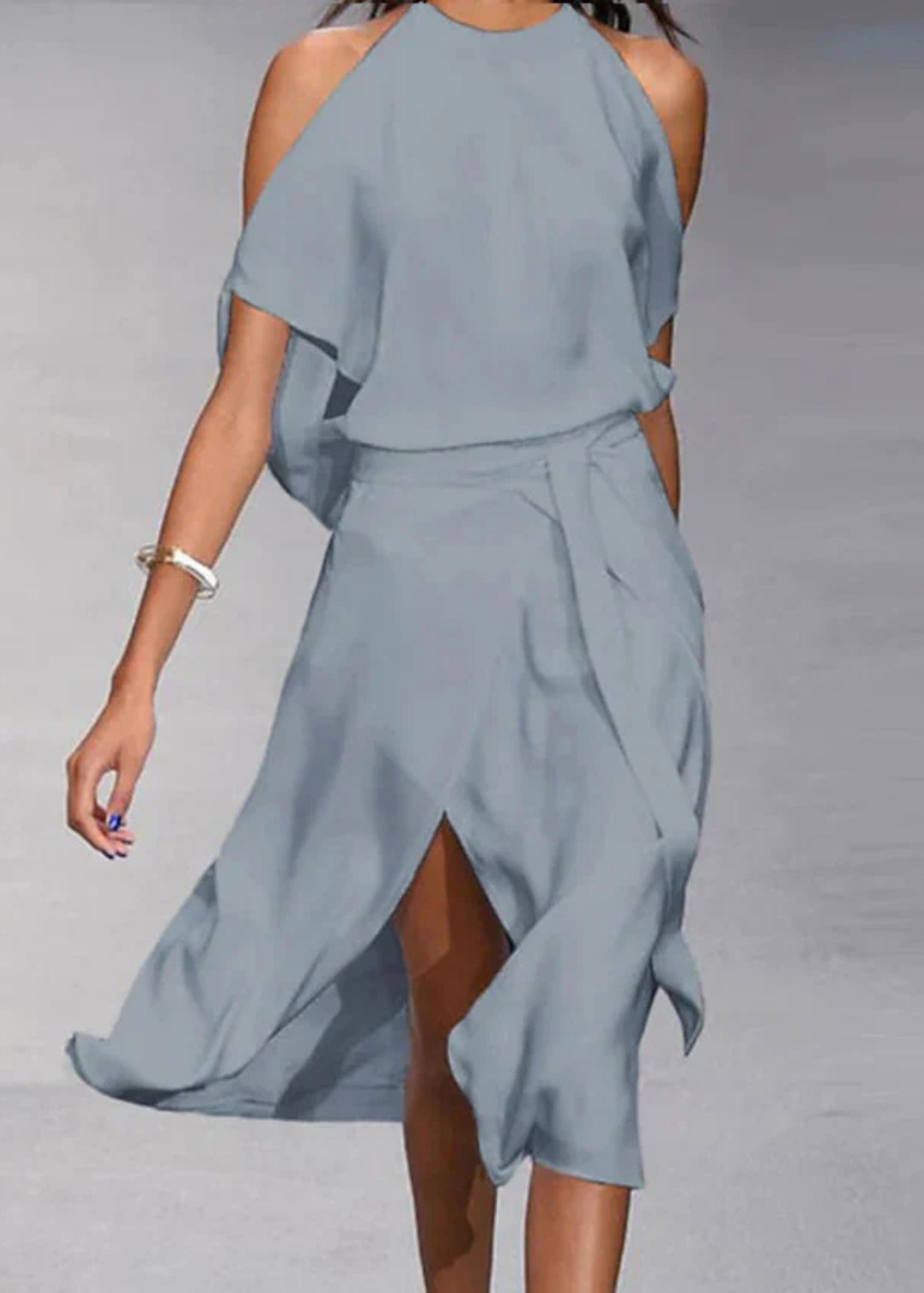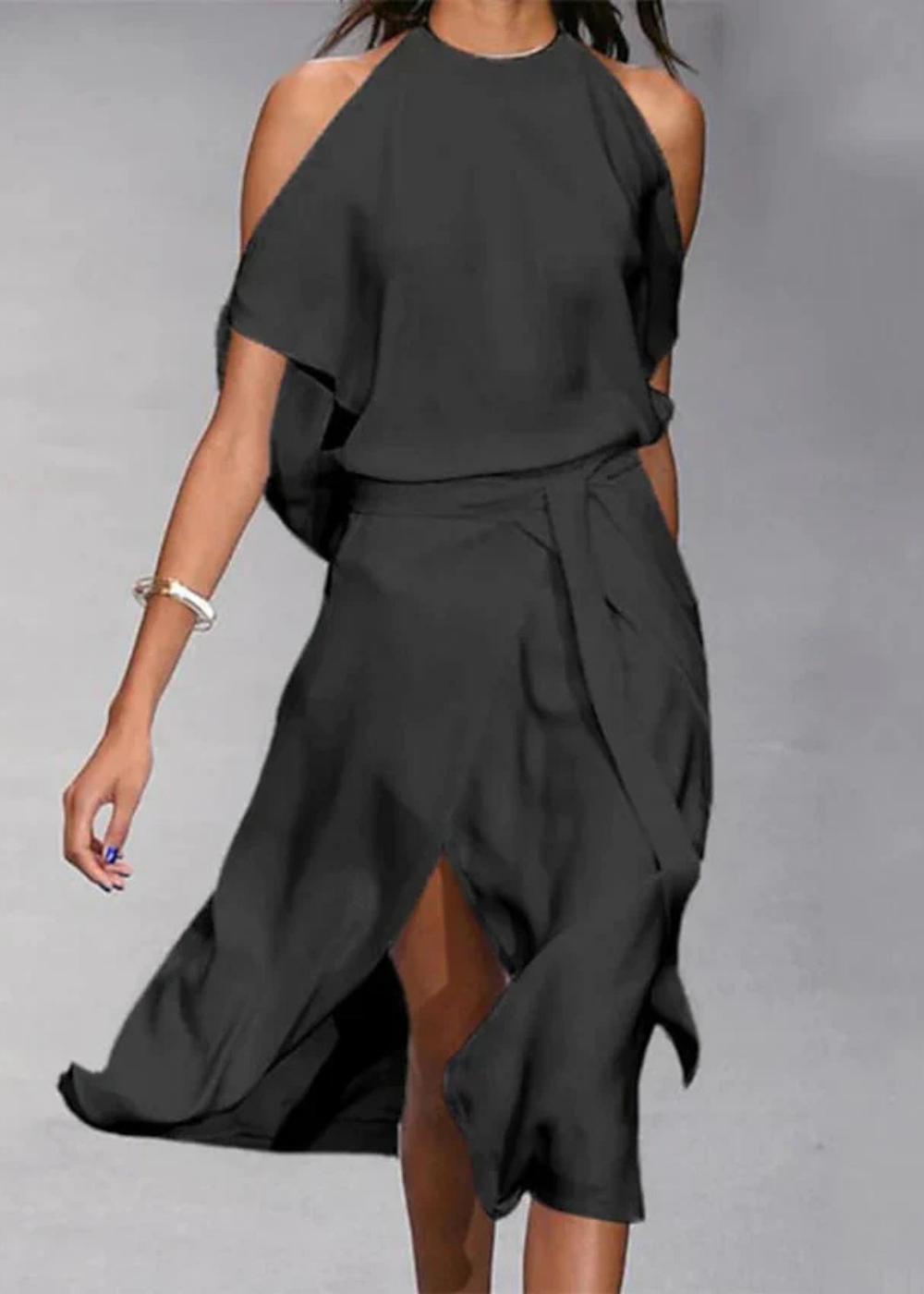 - Details: Vorderer Schlitz, offene Schultern, lockerer Faltenwurf