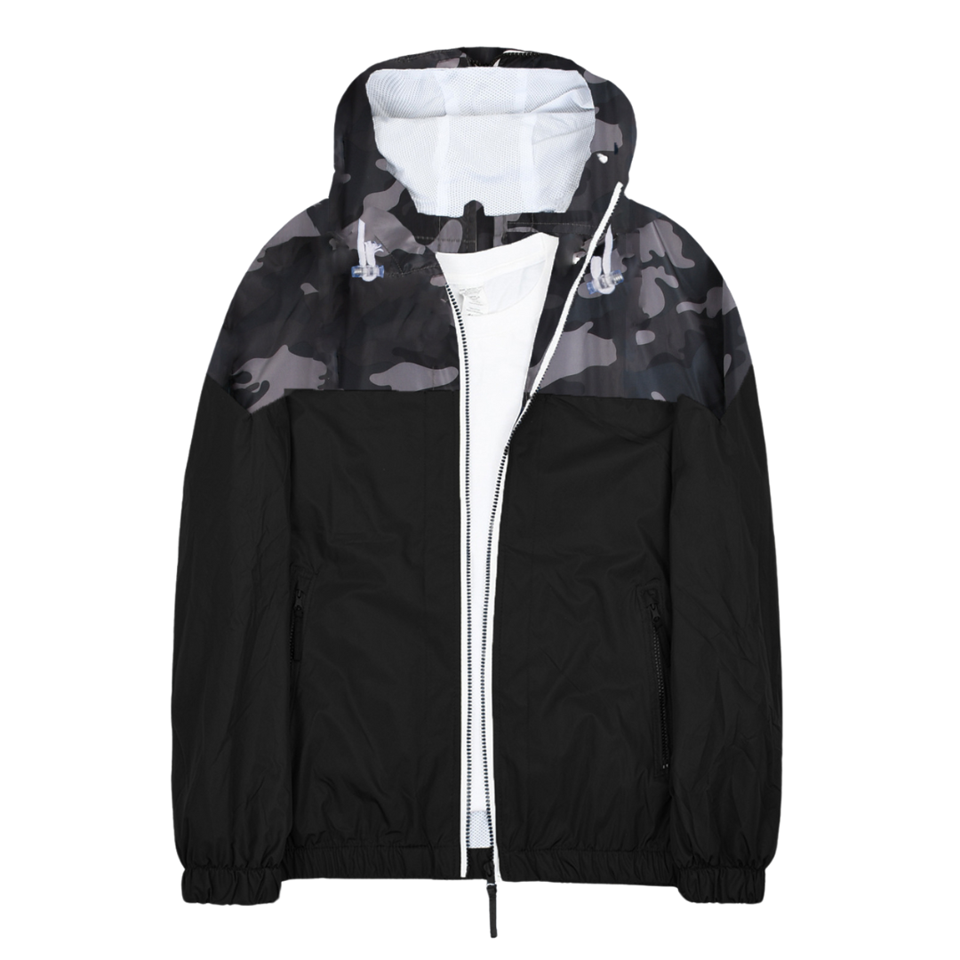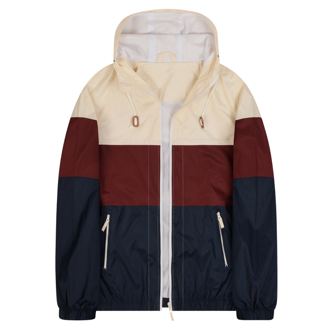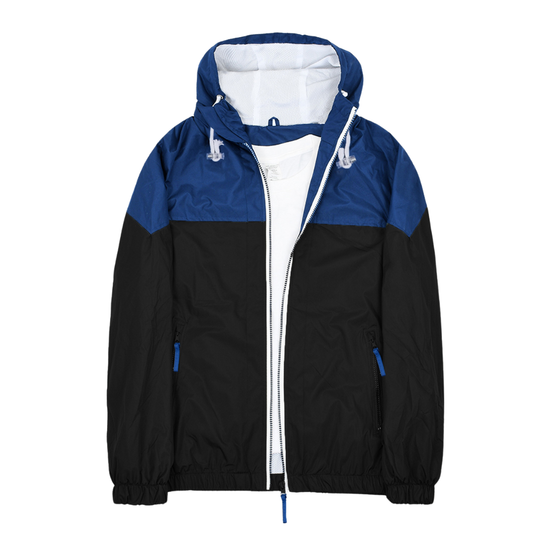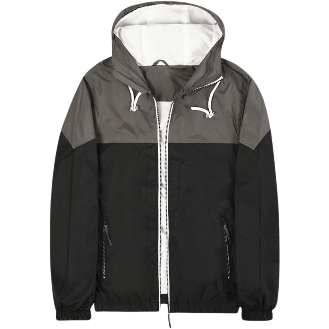 Diese leichte Jacke zeigt ein zweifarbiges Design mit durchgehendem Reißverschluss und angesetzter Kapuze. Die Kapuze ist mit Kordelzügen und dekorativen Akzenten ausgestattet. Seitliche Reißverschlusstaschen und elastische Bündchen sorgen für einen sicheren Sitz und machen die Jacke zu einer funktionalen und stilvollen Wahl für die Übergangszeit.