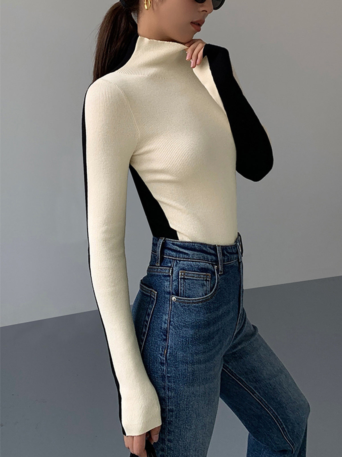 Zweifarbiger, doppelseitiger, langärmeliger Strickpullover in zwei Farben